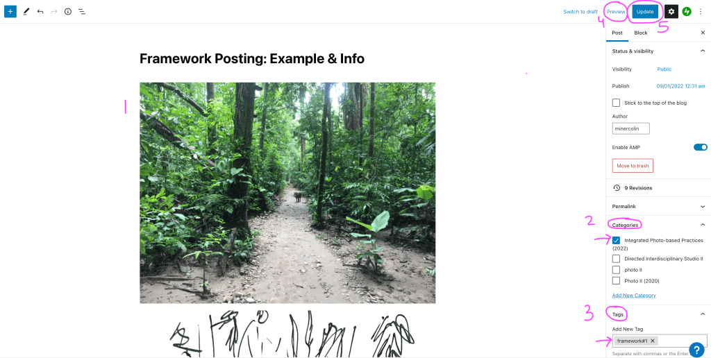 Screen capture highlighting various steps in making a blog post: