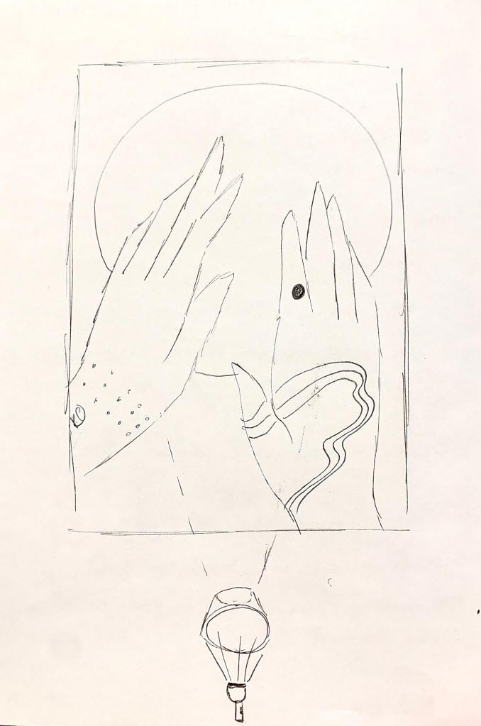 The light refraction was created by shining a phone light through a glass bowl, producing a round orb onto a blank surface similar to the orb of light behind the hands in the oil painting. The first trial of this photo experiment included taking three separate images: left hand, right hand, and light refraction. The product of the first trial was more favourable in terms of image quality and composition, however it required digital manipulation and photo editing, including the process of layering three separate images onto one another to achieve the desired representation of the artwork. The second series of photos included all three components in one single shot. This was a difficult feat as the two subjects’ bodies could not be positioned next to one another comfortably in a way to accurately model their hands truest to the hands in the painting. Other obstacles included the shadows of the subject’s bodies and my own shadow getting in the way while trying to capture the shot. In order to mitigate casting my own shadow onto the framework I had to take the shot from further away. This choice resulted in a reduced image quality.I opted to present the image from my first trial. My process was inspired by Eduardo Cadava’s essay “Reflections” which contemplates perception and refractions of light.
