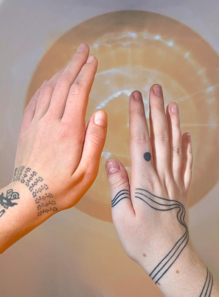 This is an image of two still hands with a circular light refraction cast onto the surface in their background. It was taken on an iPhone camera. The photo is a response and photographic representation of Claire Lehmann’s oil painting Painter’s Hand, Patron’s Hand. The photographed hands belong to an artist and a client who modelled for me in my house against a blank wall. The hand on the left is one of an artist who tattooed the line-work on the hand on the right. The tattoo on the right hand was a commissioned piece of artwork which signifies that the person wearing the tattoo is the patron. In the painting, this is signified as the right hand by its ruby ring.