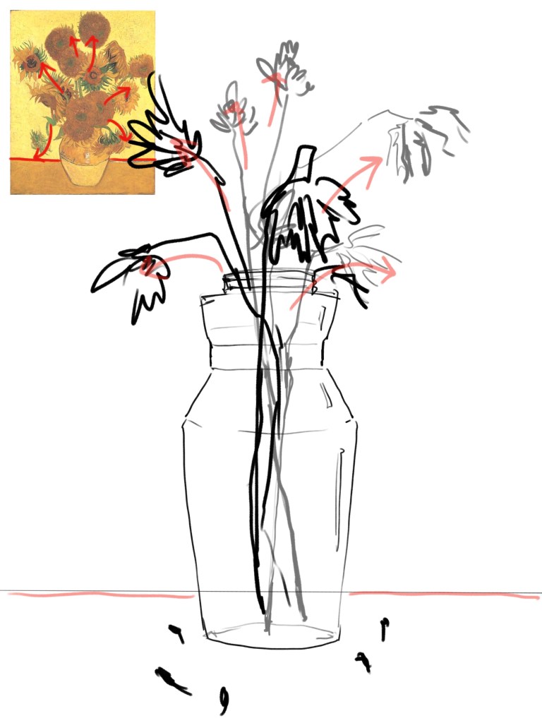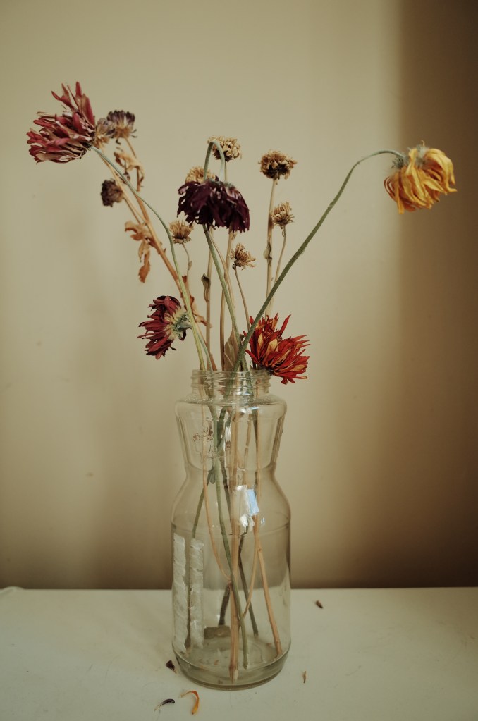 Vincent Van Gogh wrote that his painting Sunflowers conveys the idea of ”gratitude”. To my understanding, it is about his love and appreciation for such lively and vibrant color nature provides us. In my recreation, however, i want to portray a different kind of aesthetic. I preserved some tried flowers from the past and put them together as a collection of “dead” nature. The picture recreates the original composition and color scheme. Some colors have faded and the fragility if the flowers are shown by the fallen pedals. I aim to capture the exact opposite of the Sunflowers which is the beauty of things that are past their prime.