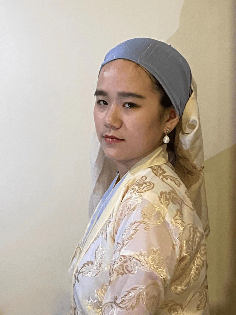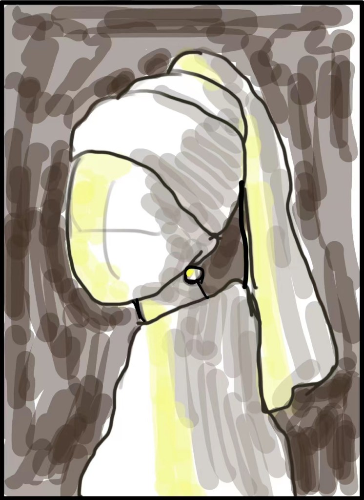 This is a sketch of Girl with a pearl earring. Girl with a pearl earring is created by Johannes Vermeer in 1665. It’s a controversial painting where the girl’s dress makes it feel like she should be royalty,. But we can’t find her in history. The reason I want to set up the fake for this artwork is that the girl’s movement is interesting and mysterious. The action can be she is looking towards the viewer or she is looking away from the viewer. When I set up the fake, I more focus on the light – where do I put the lights then I can have the same effect as the painting. Because this painting can clearly see the change of light, I tried to use different colors of light to achieve the same effect as the painting.