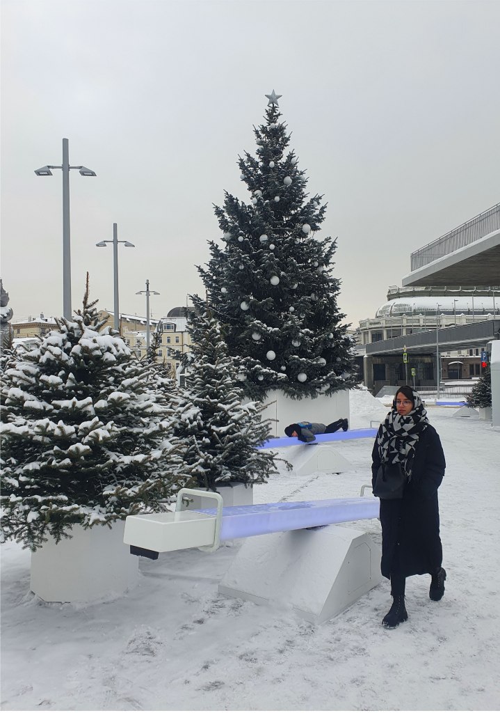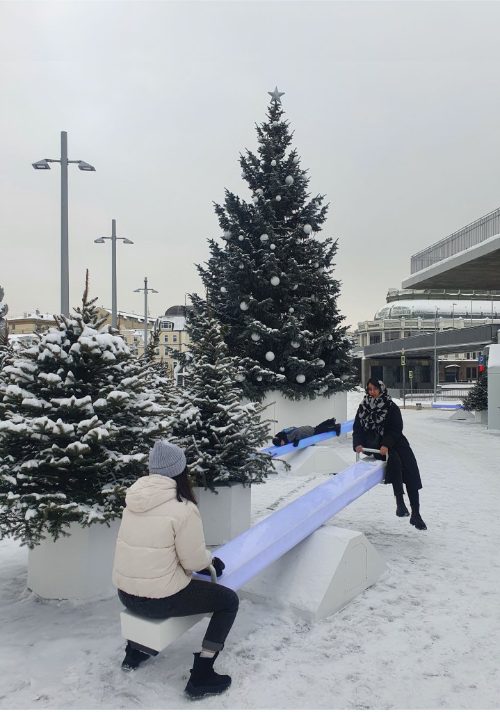 In these photos, I wanted to showcase the experience of a fairytale-like corner in the middle of a busy city. This public space is located in downtown Moscow, people are passing by, however, if you stop to take a look you will get immersed in a holiday atmosphere, by having fun riding the seesaw or simply enjoying a nicely decorated space.