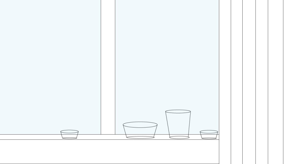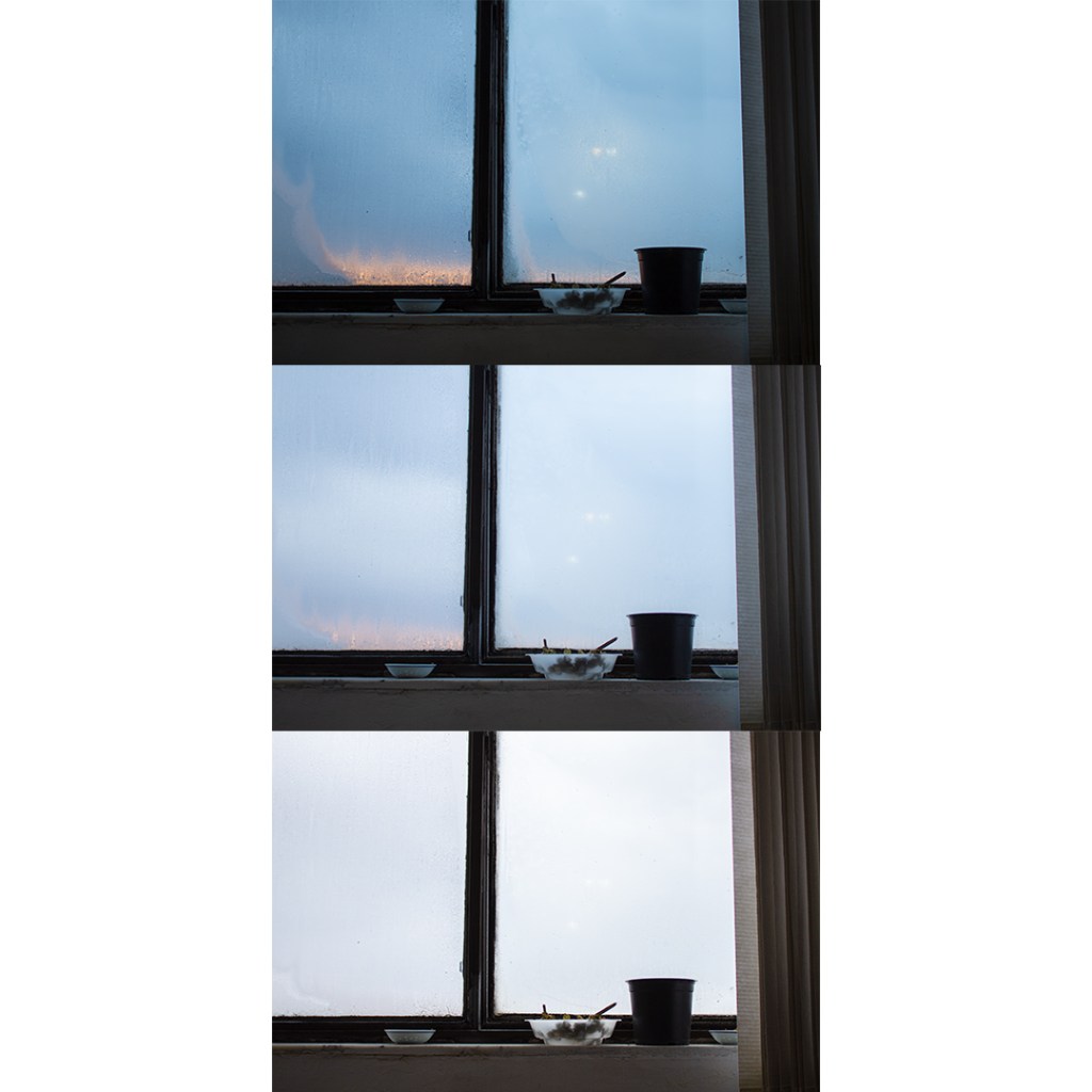 I’m often fascinated by the light that can be seen through the windows of my building. These images were taken in the morning, when the sun was beginning to rise. I used the notion of a frame within a frame, a concept often used by Wong Kar Wai in his films like In the Mood for Love. Along with the framing of the camera, I used the frame of the window. placed the images one after another vertically to resemble a film strip. This mirrors the sequence in which I took the photos. It seems like the objects in various containers are also watching the sun come up, beginning to wake. The coolness of the images also echoes the cold atmosphere.