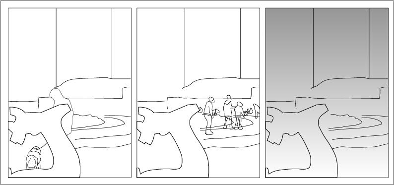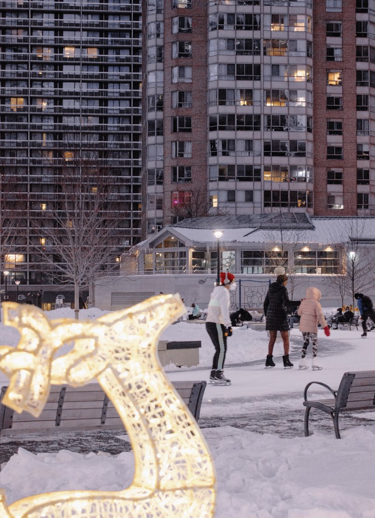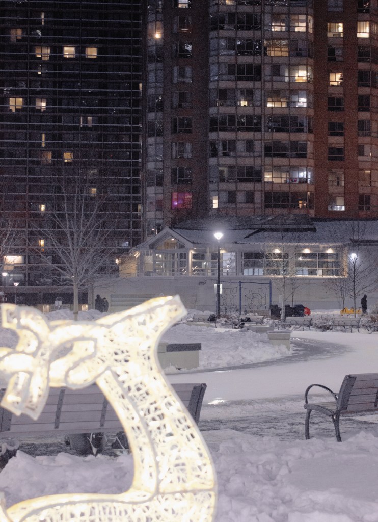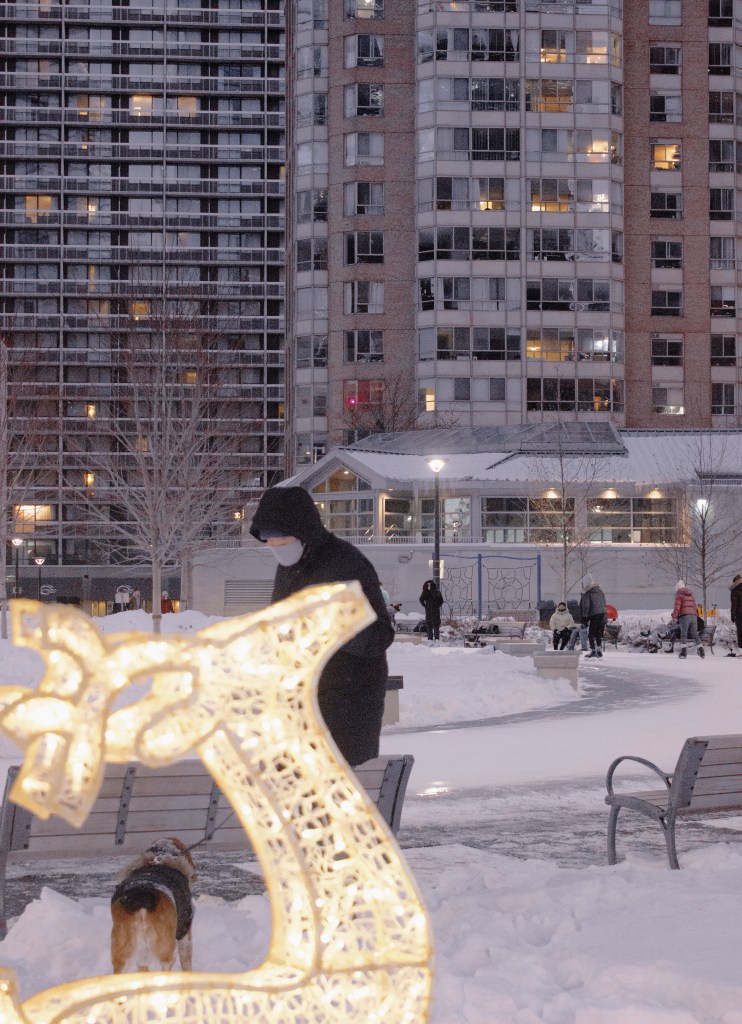 I positioned the camera next to a Christmas light show next to the public skating rink and used the composition rule of third to shoot the light show. But because it is a series of photos, the scene behind the light show forms a story. Photos show the space’s multi-purpose use as an ice rink and a recreational area, for example the dog walking. At the same time, the photos also show the population of different time periods, and the comparison before and after sunset.