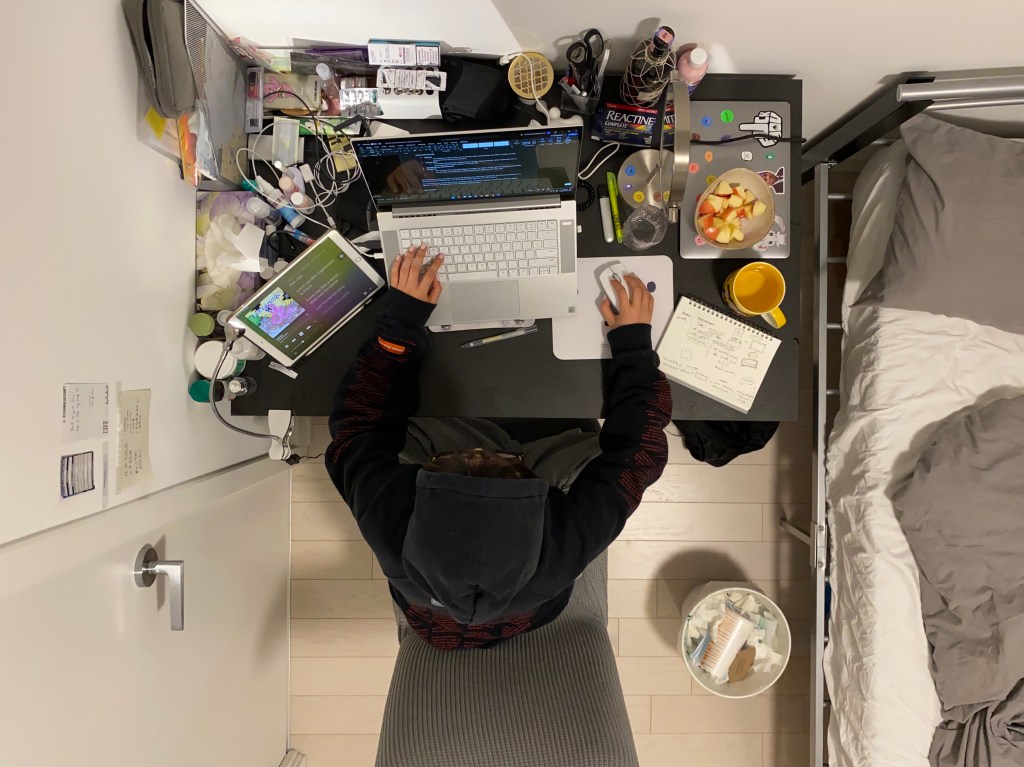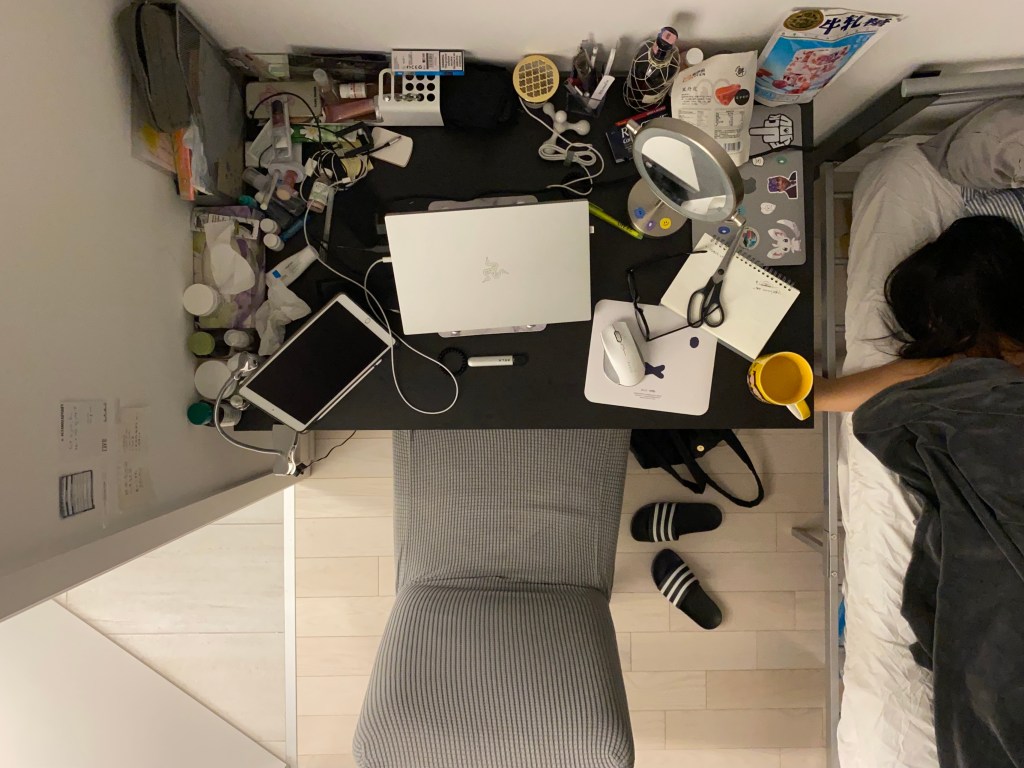 As the pandemic is lasting for almost 2 years, the bedroom has become the place where we spend most of our time, and working from home has become a new normal. Although the desktop seems to be in disorder, it contains almost all of my necessities of living, including electronics, notebooks, snacks, drinks, medicines, vitamins, and even skin-care products. We eat fast food alone in front of the digital screens, spend hours working and studying on the internet, communicate through a virtual environment. And when we can finally rest, the bed is just 5 inches away, only to start another day of isolation around the messy desktop.