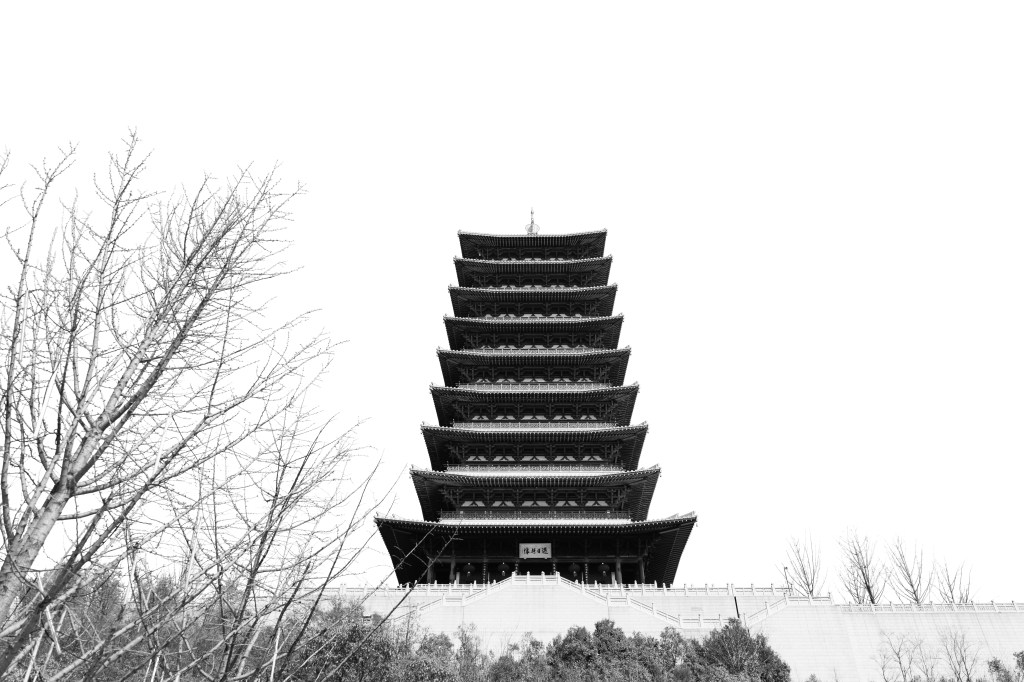 The 88-meter tall, 9 floors pagoda was newly built in Tang Style to pair with the Hongjue Temple Pagoda nearby, which was originally built in Tang Dynasty, then rebuilt in the early Ming Dynasty. The low-angle view captures the sacred feeling towards this Buddhism Pagoda on the hill. The symmetric composition and high key contrast contribute to highlighting and presenting the beauty in ancient architecture.
