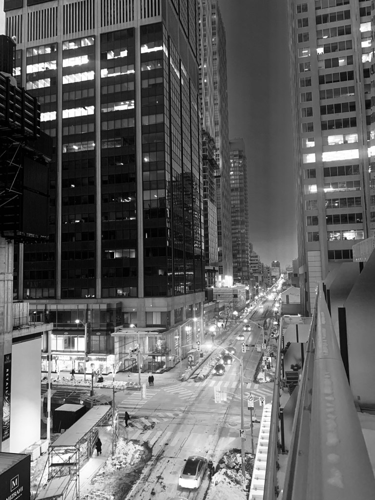 I’ve always found the sights of the inner cities very aesthetically pleasing so I figured that a low key composition of a street between buildings would look nice. I took this photograph at night where I was able to keep the colors gradient around the dark greys.