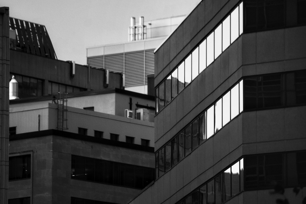 Images captured in low-key lighting usually create a mysterious and dramatic atmosphere. They can display a wide range of profound negative emotions. Like my high key photographs, I choose the same place to shoot but with different views. By moving out from the lively elements, like animals and humans, I focus on the layering of the city. I want to increase or enlarge the modern and industrial sense of the environment and add a mysterious feeling to it. The window reflects the bright sky to give the photo a sense of having a story, to bring up the audience’s curiosity about what happened behind the window. I did not darken the light on the window, to form a difference between the natural sky and building layering.