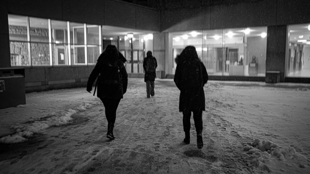 Three in snow is an examination of low key photography techniques. Rather than setting a pure black background drop to create the studio-like photography, I choose to shoot outdoors. First I chose the location and then I invited three friends to be my models. To create the feeling of gloom and cold, I chose to shoot the photograph on a snowy night.