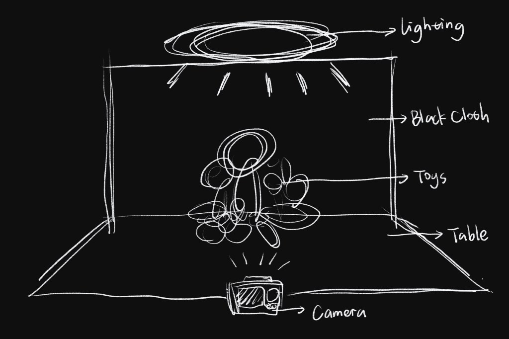 This framework practices the low-key composition of grey to black using toys as the subjects. Firstly, I set up a black backdrop to create a dark background. Secondly, the artificial light source is right above the subjects in order for the light to hit on them directly, rather than in the background. Then, the ISO is set low to create a more dramatic effect and hard-hitting emotions, bringing the stuffed toys to life. By lowering the exposure and creating more shadows, the details are concealed and revealed creatively. The composition of the toys is also specifically arranged as if they are taking a family portrait.
