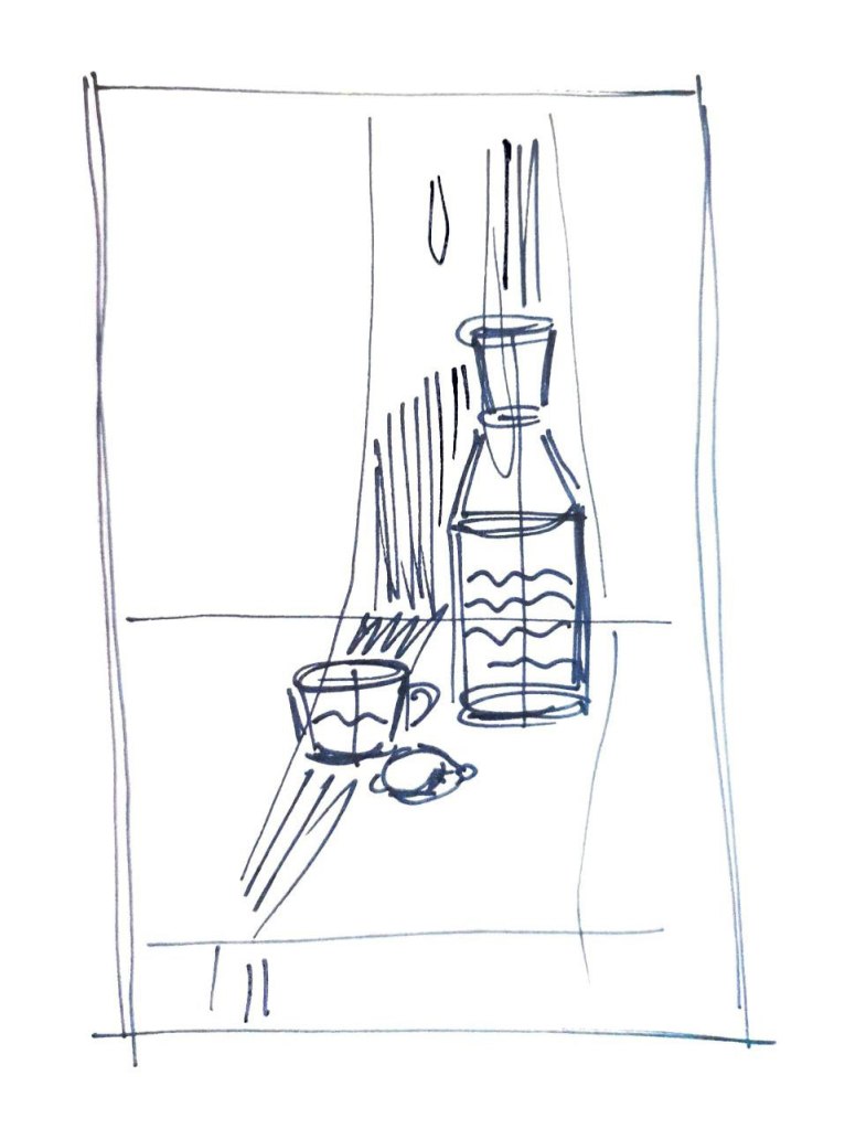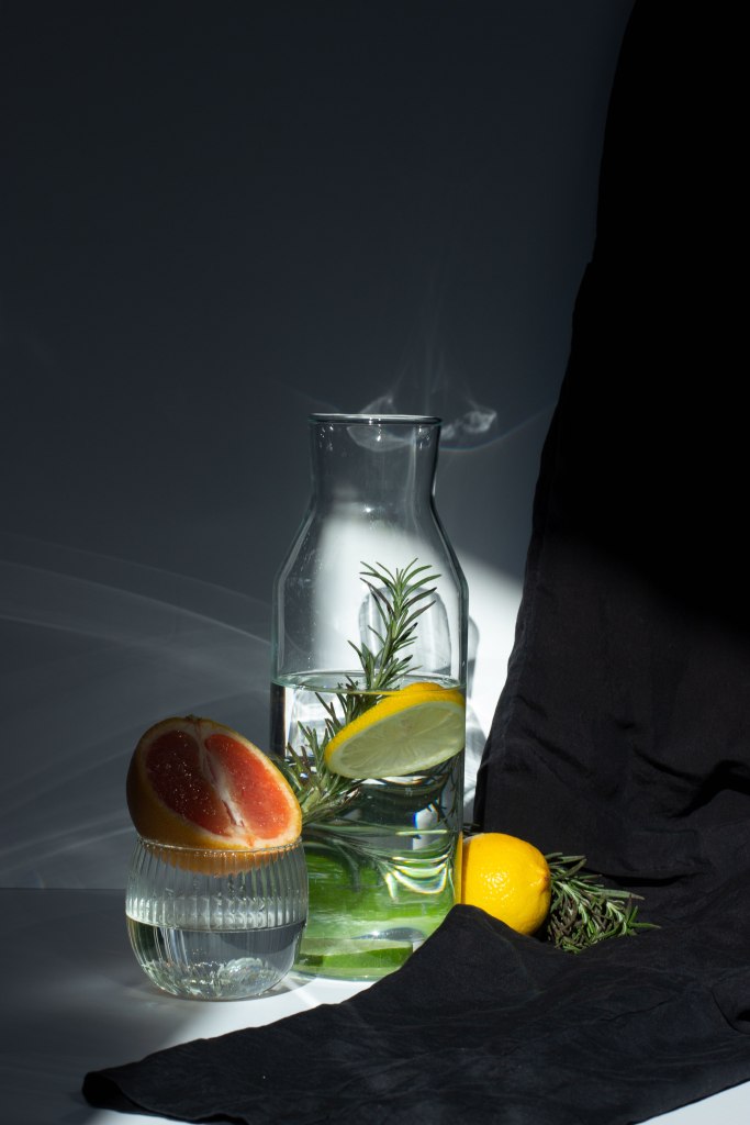I have been fascinated by the concept of reflections and shadows for a long time so I wanted to take an opportunity and explore the theme in this still life. I played around with water and glass as I thought such combination might produce some interesting visuals. Luckily, Toronto got a couple of sunny days, which also played into the overall composition. Water and glass reflect both light and accompanying objects, creating various highlights and distorting some parts.