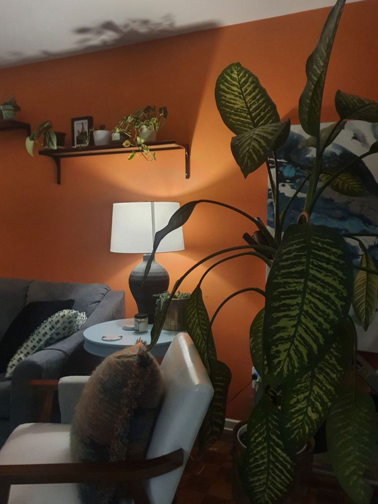 This interior moment is a photograph of the living room in my friend’s rented apartment. The orange wall was initially there, left by the landlord, and we all really liked it. I also thought that the wall and the green plants create a great combination of almost complementary colours.