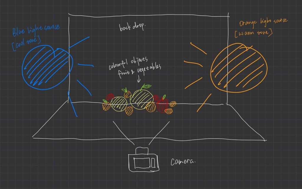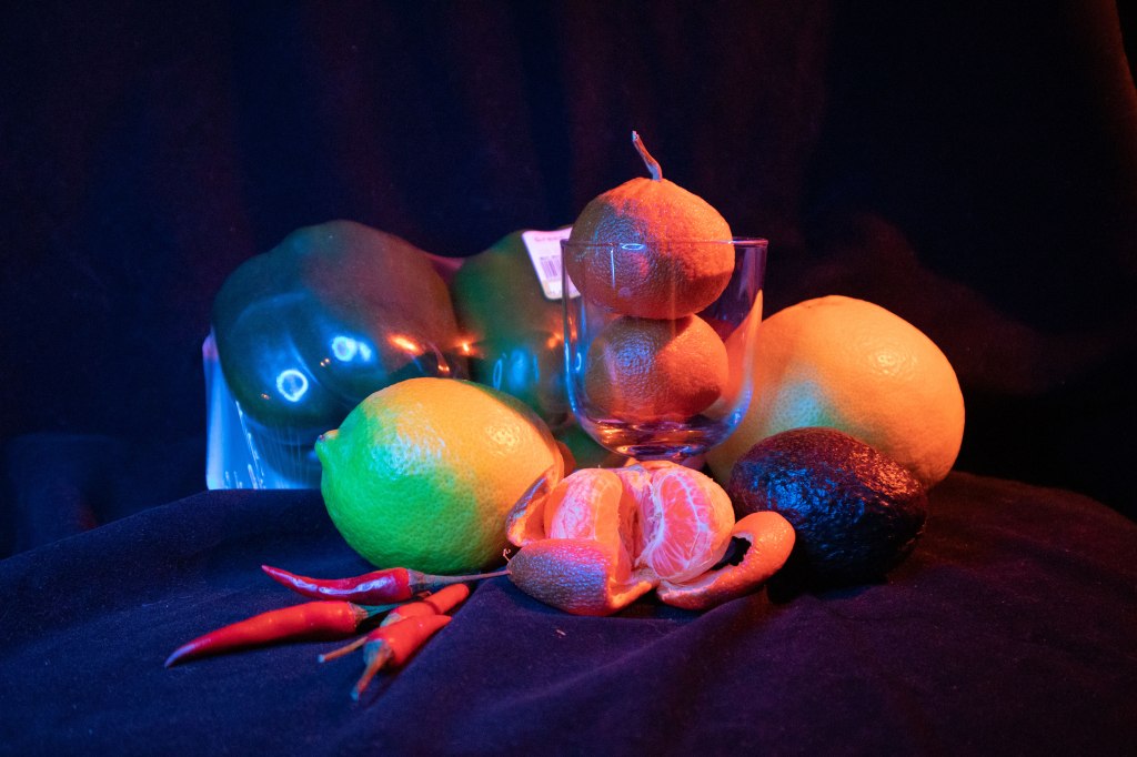This still life framework experiments with different colors of lighting and their effect on the object. By using complementary colors, blue and orange lights on each side of the object, the color of the object changes according to the light sources. For example, the shadows on the lemon and grapefruit appear to be green, while some parts of the red peppers and oranges become purple, as a result of the mix between the color of the object and the color of light.