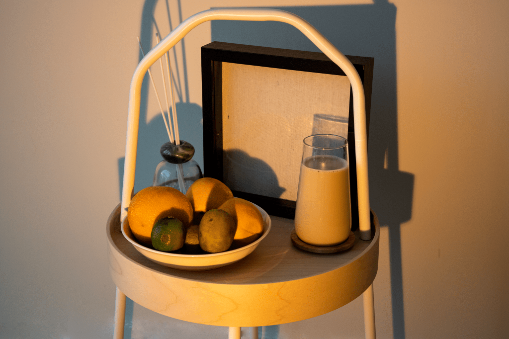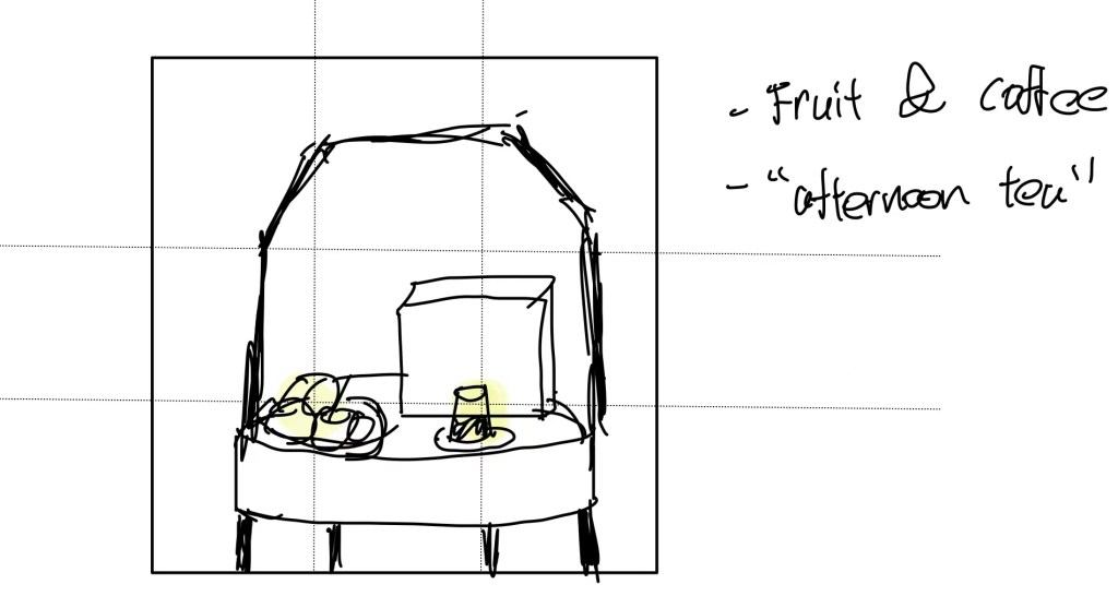 A still life is a collection of pictures or paintings composed of motionless objects. So what I wanted to showcase in this frame was an afternoon tea that I prepared for myself when I had time. A plate of fruit and a cup of coffee, I put them on the “Focus Points” (just like sketch), so that the viewer can see them at a glance. To make them look tastier, I put a yellow light in front of the table. It makes food look better, tastes better, and creates layers of light and shadow.