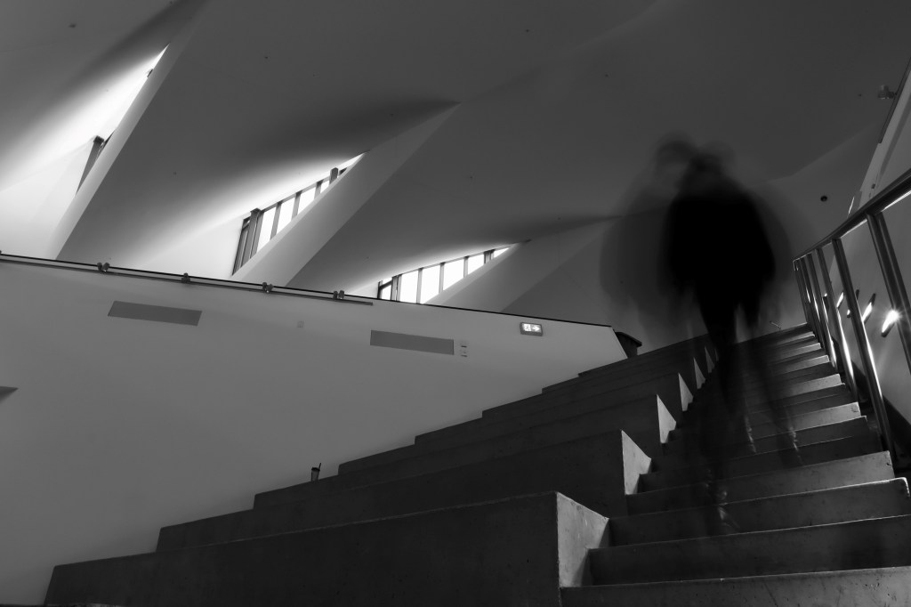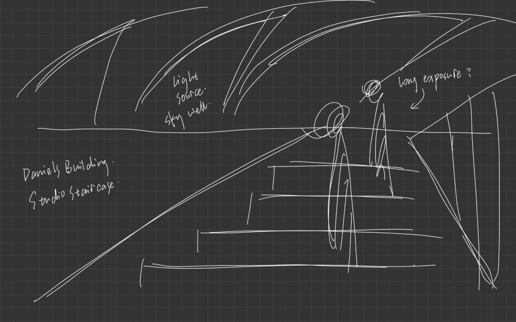 This b&w image was taken at the Daniels Building in school, more specifically the hang-out staircase connecting the second and the third floor studio space. This framework uses a worm’s eye perspective, shooting in a bottom-up angle in order to capture the windows on the ceiling, which are the main design features of this building, which also allows as much light as possible to come in. Besides photographing the interior architectural space, this image also includes a blurred figure passing through the staircases using the technique of long exposure, adding a sense of liveness and movement.