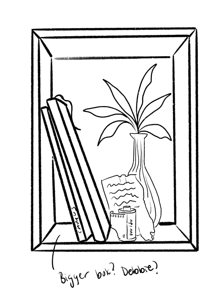I originally wanted to document my interests in a smaller space like a box but found the images took on a claustrophobic aura and were also too dark to catch the details in the books and letters I placed in the box. I set up this framework for test footage of a video I am making. I decided to take a picture.