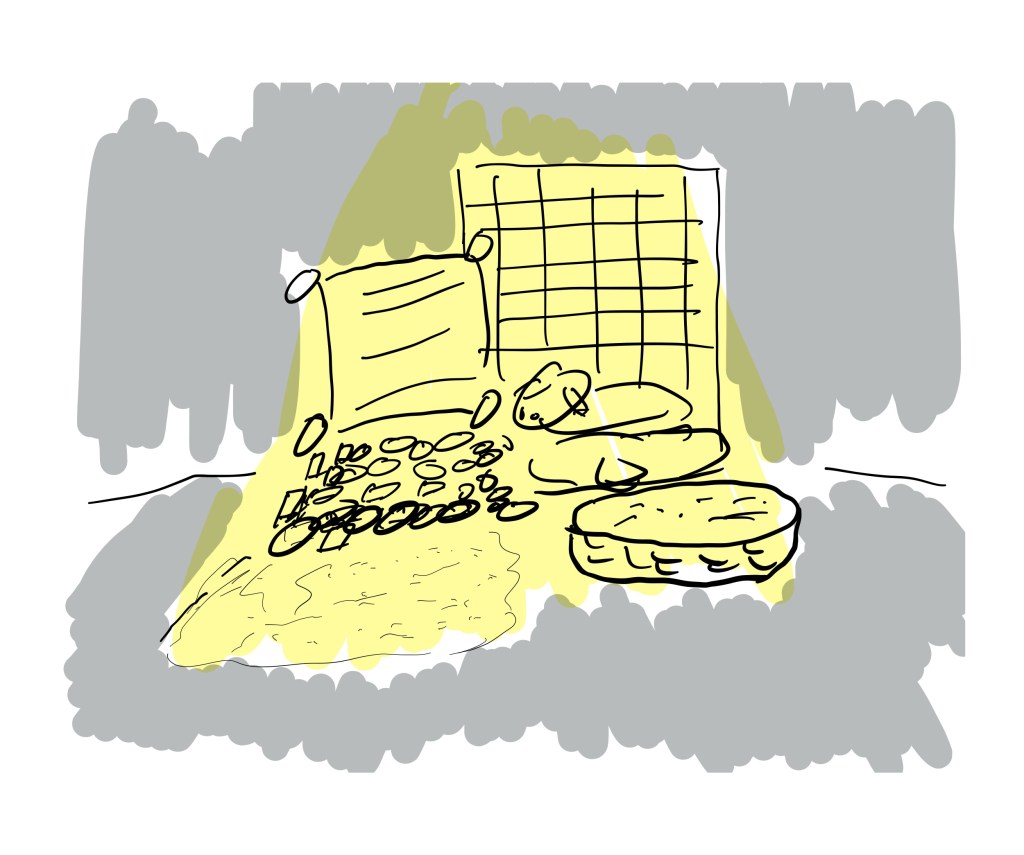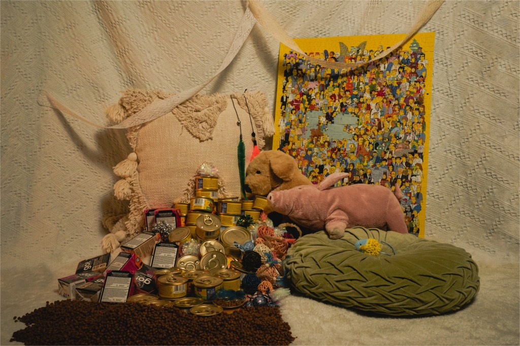 I create a still life about my cat and the playful world I created for him. The still life consists of canned food, dry food for my cat, the cushion and plush toys. I made the cat food in the shape of a small hill to create a sense of plentifulness. As for the lighting, I placed a top warm light to add an intimate feeling to all the objects.