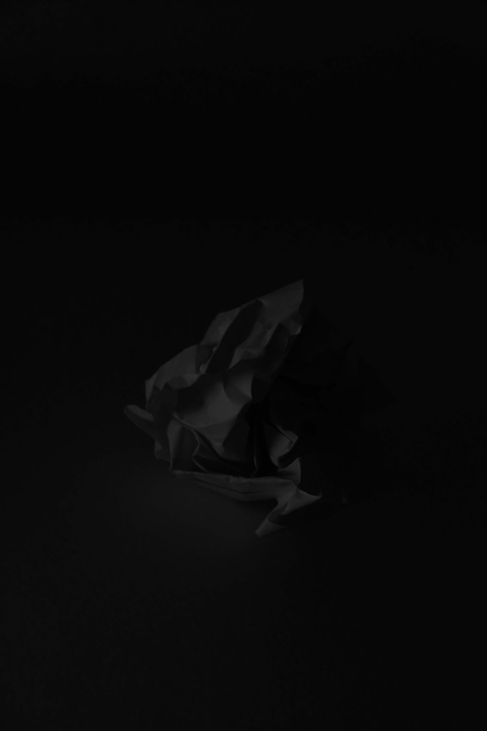 For this composition, I continued to experiment with the crumpled piece of paper and the unique shadows and highlights that it created. In the dark, with minimal lighting, I was able to create subtle highlights in this gray to black composition.