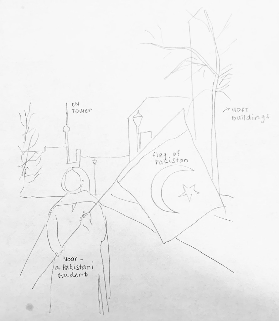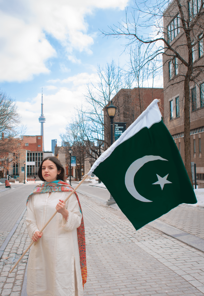 Similarly, I photographed my friend who is also from Pakistan and came to study at the University of Toronto as an international student. She wears traditional clothes and holds the Pakistan flag in her hand, representing the values and culture she brings along with her. This recreation combines my interest in people with a modern aesthetic and is representative of a revolution. There’s a lot of pressure leaving your home to study and build your life, and so many women today are given the opportunity unlike the past. I wanted to recreate this image highlighting the positivity that exists in the 21st century, thus, I chose to have a coloured photograph. I took the photograph on the street that leads up to King’s Circle, having the CN Tower as an emblem of Toronto in the background.