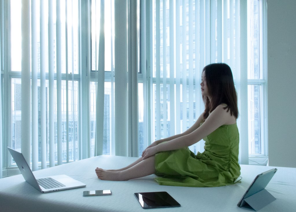 Someone has said that Hopper portrayed a world shut down, which I think is corresponded to our world during the pandemic time. People are isolated at home and spend more time with screens rather than people than before. Therefore, I place the electronic devices around my model. Though the original painting is named Morning Sun, I photograph the work at 4 pm afternoon. It is like, after a day’s remote work, the girl feels empty and tired.