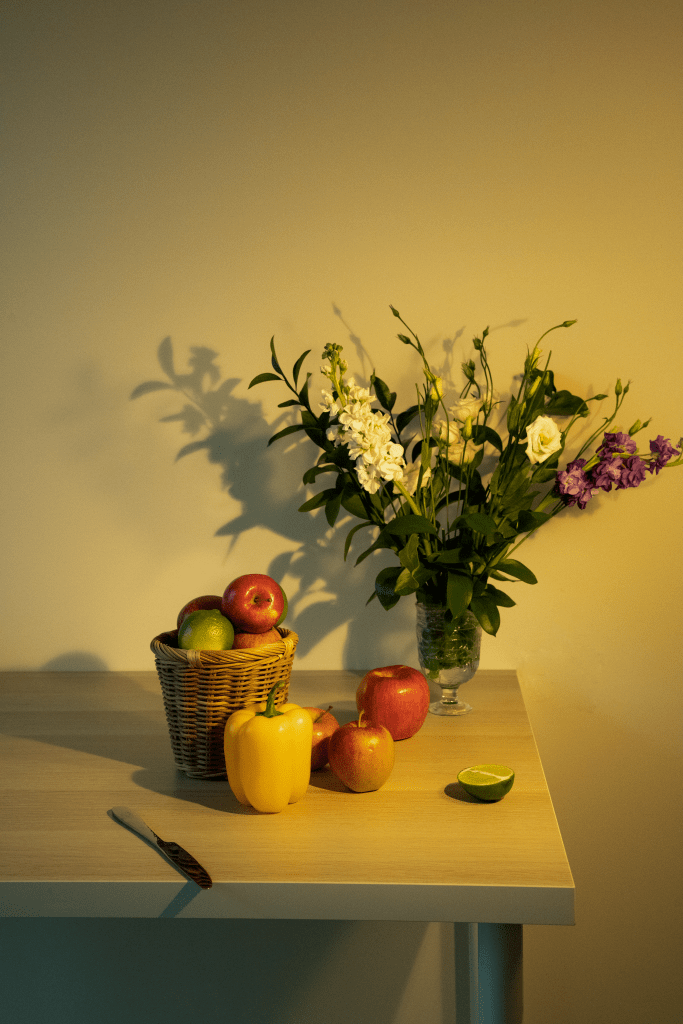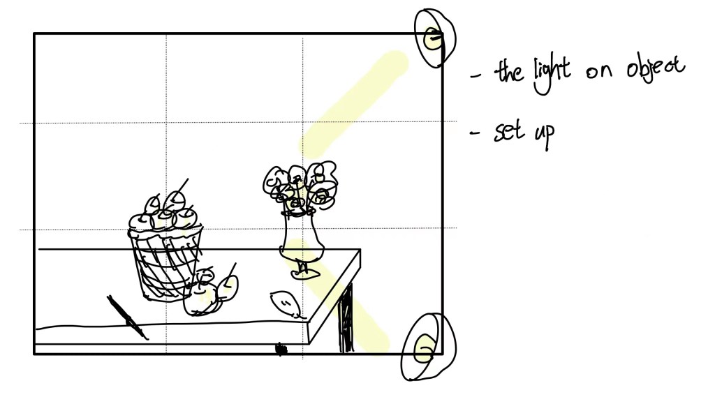 After 7 frameworks work, I found I was more interested in Still Life images, so I decided to set up the fake for Henri Fantin-Latour’s work – Still Life with Flowers and Fruit. When I sketch this photo, I think about how to express the light in the photo, then it will be like a painting and how to make the photo more like an oil painting. I chose to shoot in the afternoon, because the natural light outside is not so bright at this time, and two more yellow lights can create the shadow and highlight of the object. The composition of the photo is to place the flowers and fruit on two “main points.” After I finished shooting, I used PS to adjust the picture to warm colors and processed the areas that were too white.