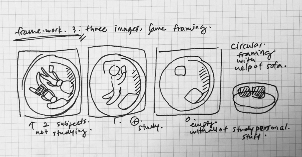 In addition, instead of trying to capture an image where typically subjects may be portrayed upfront, I experimented with different angles and decided to stick with an aerial view in order to convey a unique framing method: the circular outline of the sitting space. I found it a bit difficult trying to get a clear image in aerial view because enough height was needed for me to create a decent circle. However, I managed to use the surroundings around me and used a selfie stick which was really interesting as well. In fact, I was surprised by the results to the point that using a selfie stick, as a form of taking photographs, is something I want to experiment with further in the future.