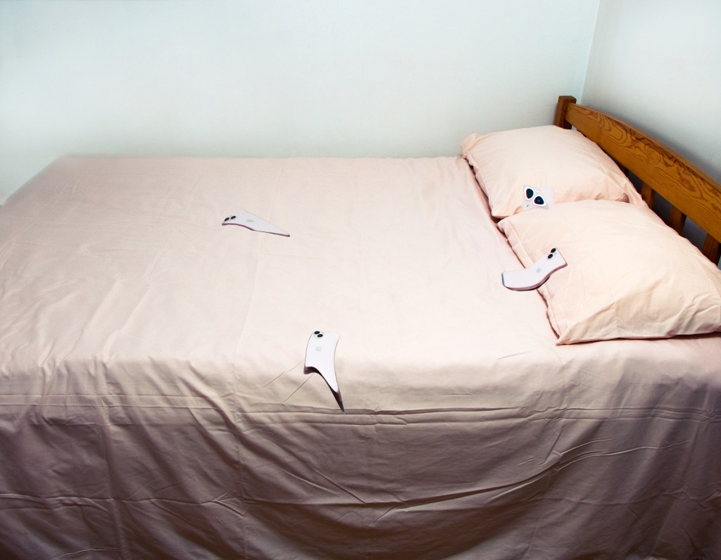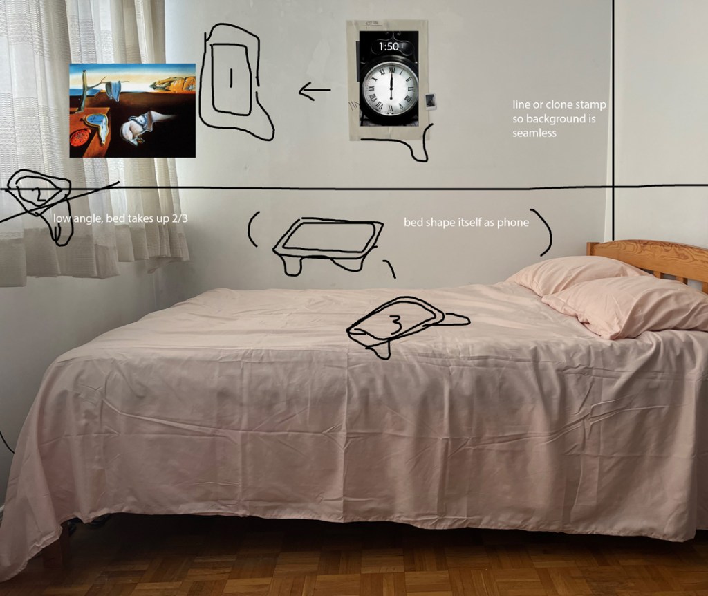 I based my work on ‘The Persistence of Memory’ by Salvador Dali since I’m interested in surrealism. I was originally going to have the time show up on each of the phones to show the idea of being glued to this notion of time, but it was hard to photograph the phone from that distance and the pink of the phone matched my bedsheets, so I photographed the back of the phone instead; it was easier to show its form, and the concept became more about the persistence of technology. The original work was about a dream Dali had; I made explicit the way in which people are tied to technology, with phone usage being one of the common examples.
