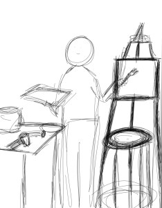 Almost immediately after showing August Sander’s Master Mason in class, I had the idea to use my studio space for Painting III to create an image of a similar idea. I do not consider myself a master, hence why I titled it painter. I think everyone still has the opportunity to learn even if they are considered a master of their craft, so I wanted my version to tell to that, especially since my temporary studio space is on campus.