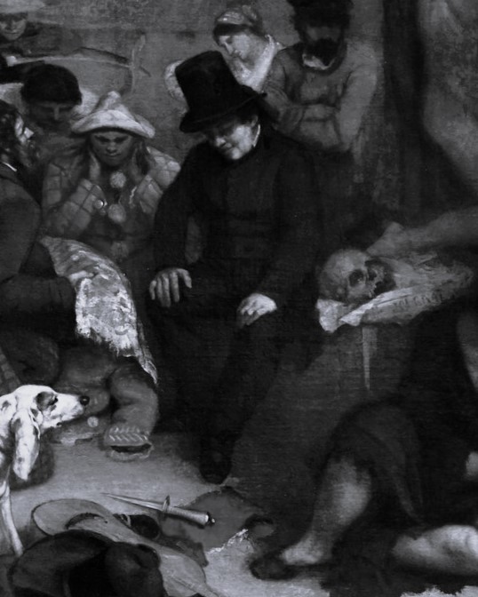 - I believe I captured the general composition of this portion of the painting well, given the limited objects and wardrobe I had in my house. I also think I captured the body stance of the undertaker well. I am quite happy with the framing overall and the lighting on the right side of the photo and believe the lighting on the face is quite accurate to the painting.