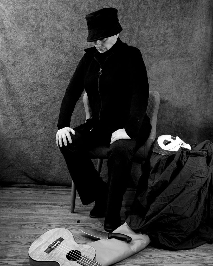 - I was highly committed to this project and spent several hours working the lighting and composition. I tried several musical instruments and settled on the uke because the scale seemed to work best. I also tried several wardrobe/hat choices and chairs to see what fit the composition and reflected the painting best.
