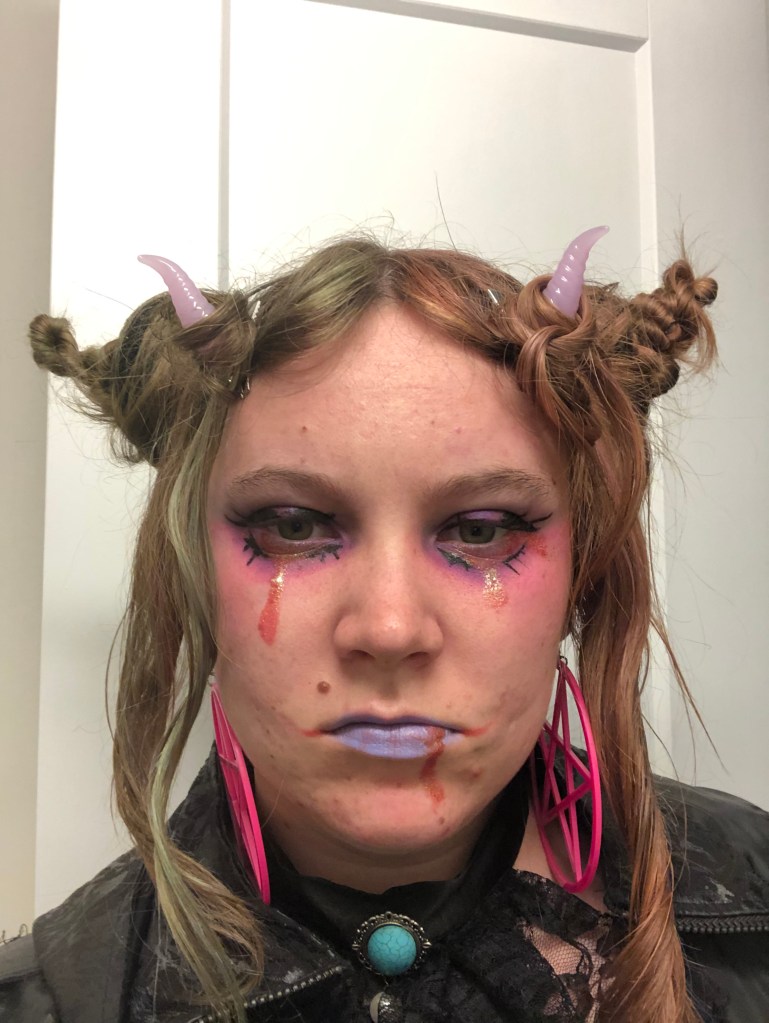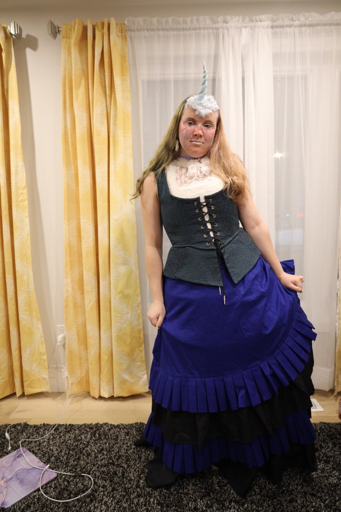 Unicorns are seen as mythical creatures that flock to pure maidens and so instead of doing simply an angle or holy priestess I incorporated a unicorn horn to play up the cult of domesticity aspect and slightly poke fun that Unicorns are denoted to be male but my outfit is traditional female attire and ironically for me I would define such an outfit as being peak masculinity for me. Similarly for the demon I am dressed in somewhat flashy attire that highlights a afab body but the neckpiece was something typically worn by men called a jabot and would place the demon as a succubus as while not as traditionally masculine in look the feeling is there which I would ascribe to being feminine.