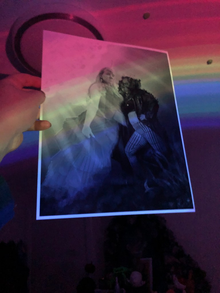 Also the black and white image is powerful but when making it there were small pops of colour in effects I added and it looked really fricken good but I also knew that I did not want to remove colour so I’m going to project a rainbow onto it as a workaround. The sample test is in the gallery so if it hits at the right angle it’ll look sharp. The rainbow is a jab of spot in this is very queer in case the image feels ambiguous still. I mean I’m in over the top looks and dramatic as heck lighting.