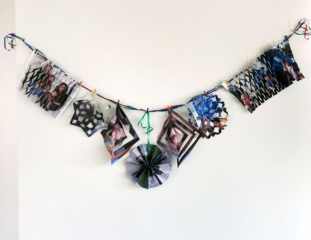 I chose to present these in the form of paper crafts I used to do with my kids when they were little as another play on memory and family events. The cutting and folding modified the photos enough that the visuals are distorted but still identifiable as family photos. I display them on a colourful ribbon reminiscent of family gatherings and celebrations using tape and colourful pins.